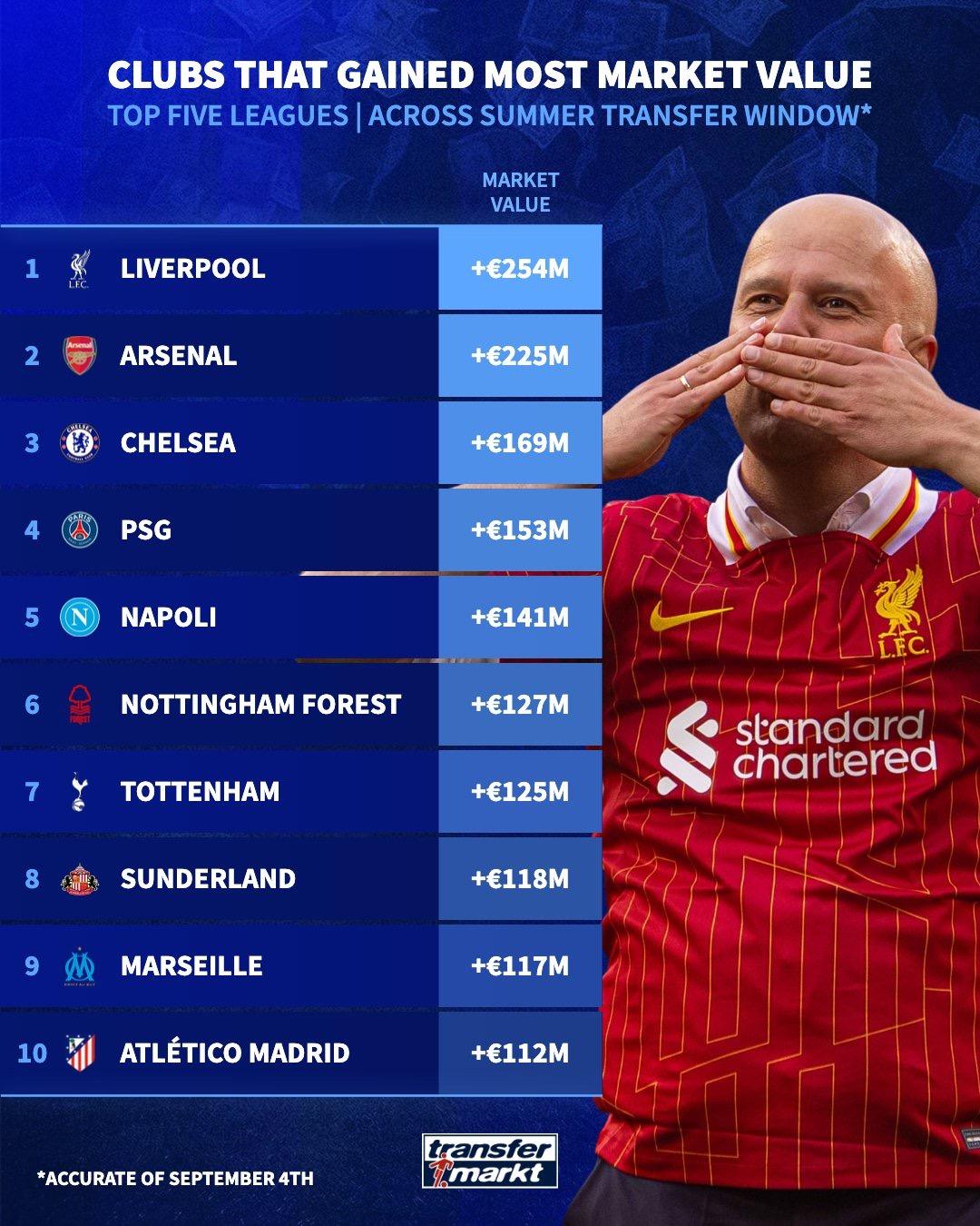 虎扑09月05日讯据德转统计,截止9月4日在今夏转会窗期间,五大联赛多家俱乐部的总市值上涨幅度明显。其中,利物浦涨幅最大,总市值上涨2.54亿欧元,位列榜首。
